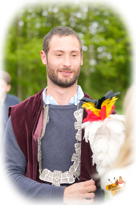 Frédéric Seykkens, le roi de l’année précédente, a remis symboliquement à Simon les insignes de son titre : la cape grenat, le collier et le coq abattu, enfilé sur une flèche, servant de sceptre.